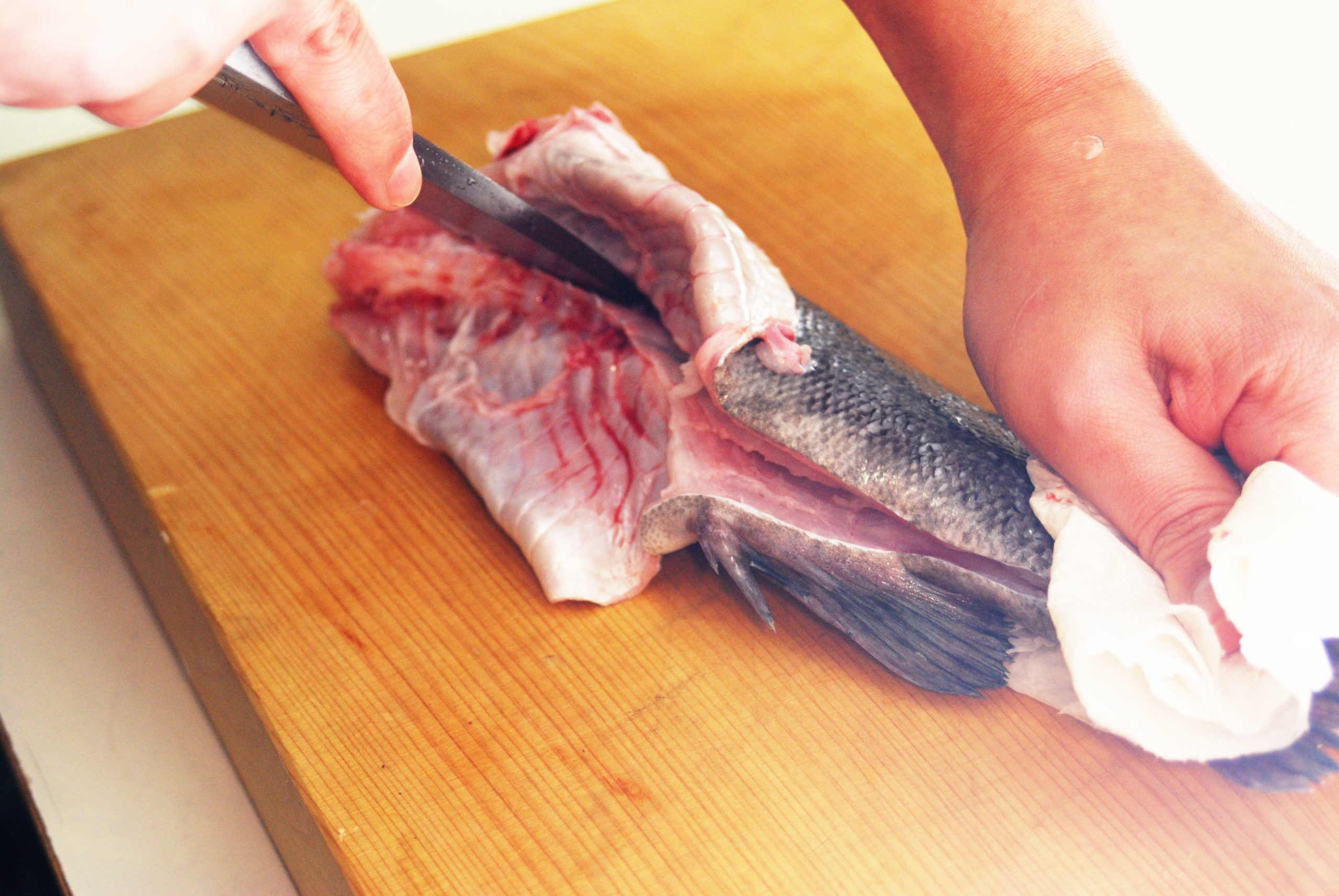 ほとんどの魚には腹骨があります。魚の身をおろした後は、この腹骨を包丁ですくようにして取り除きます。難しい作業ではありません。