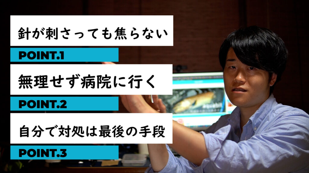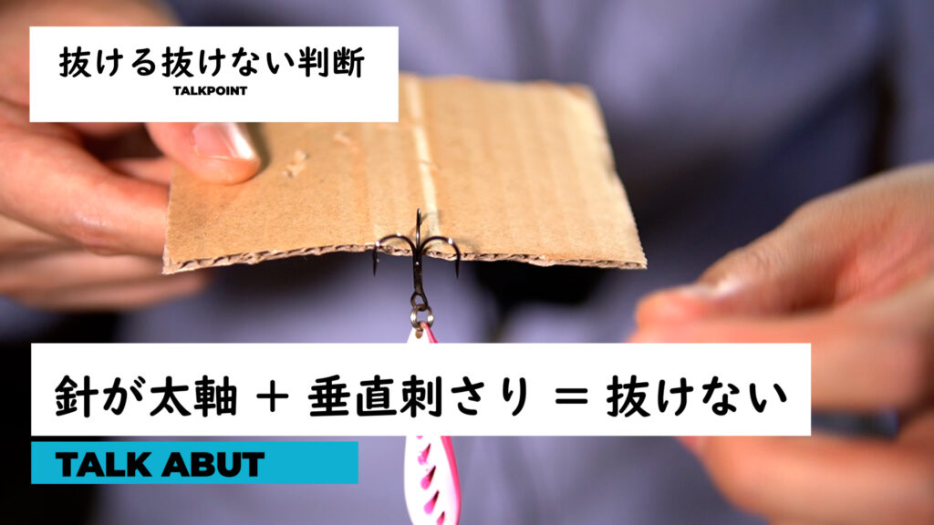 動画内では刺さったルアーのフック・釣り針の取り方をステップ毎に解説。