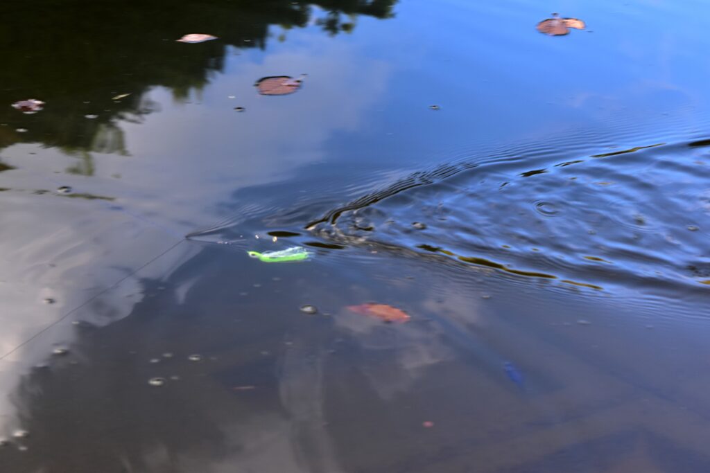 一定の速度で水面を引くことによって、バズベイトのペラによる水しぶきと音が最大限発揮されるので、沈めて使うことはありません。ただ巻きといっても、ペラにしっかり水をかませながら巻くことが重要です。